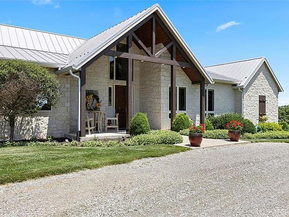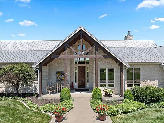 Just ½ mile south of Lone Star and 9 miles southwest of Lawrence, this rare 90-acre retreat offers the perfect blend of wild beauty, outdoor adventure, and refined living. A gated driveway winds through native prairie and hardwood timber, leading to a private home site with sweeping views of Lawrence and the KU skyline. With 35 acres of open grassland, 51 acres of timber, and 2.5 miles of winding UTV trails, the property is a dream for nature lovers, hunters, and those seeking total seclusion. Step onto the back deck and catch sight of deer moving through the woods or wild turkeys grazing nearby. Exceptional hunting is literally just outside your door. Near the pond, a fire pit and stone patio invite you to unwind beneath open skies. Built in 2012, the custom reverse 1.5-story home delivers over 5,000 sq ft of rustic elegance. Natural stone wraps both the exterior and interior fireplaces, and the vaulted great room is crowned with barn wood ceilings and ash hardwood floors. The open kitchen features a limestone island, knotty alder cabinetry, and panoramic views. Main-level living includes the primary suite, laundry, mudroom, and two offices - perfect for remote work or planning your next outdoor pursuit. Additional bedrooms, a radiant-heated family room with gas fireplace, wet bar, gym, and a safe room are found in the walkout lower level. A heated and cooled custom outbuilding with a covered porch includes a finished interior space with a full bath - ideal for use as a guest suite, studio, office, or hobby room - while the remaining space offers additional storage, parking, or workspace. A second 48' x 42' outbuilding with water and electricity sits on a separately deeded 15-acre buildable tract included in the sale, ideal for future expansion, resale, or a second residence.
