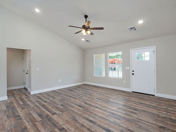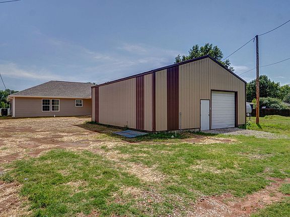 New home with with a large 32x30 shop for an extra bonus. Open floor plan with plank flooring throughout living area and carpet in bedrooms. Almost 1400 square feet of living area and 3 bedrooms, 2 bathrooms. Walk in closet in the primary bedroom. Kitchen has island and pantry. You'll love the LED recessed can lighting and the vaulted ceilings. Home has no steps into the house. The covered back patio is great for relaxing. If you are looking for a new home then this is a must see! Shop has walk in door, overhead door with opener, electric and concrete floor.