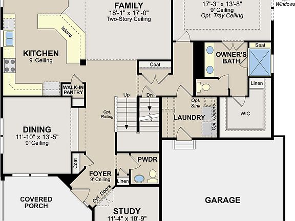A luxurious first-floor owner's suite with spa-like bathroom with super shower, three secondary bedrooms, two-and-a-half bathrooms and a two-car garage. A library is adjacent to the formal dining room and the entry hall leads into the open concept gourmet kitchen with large breakfast nook and a Great Room with two-story ceiling. Customize this home with optional flex spaces including a sunroom and finished recreation room, lower level home office/bedroom and full bathroom.