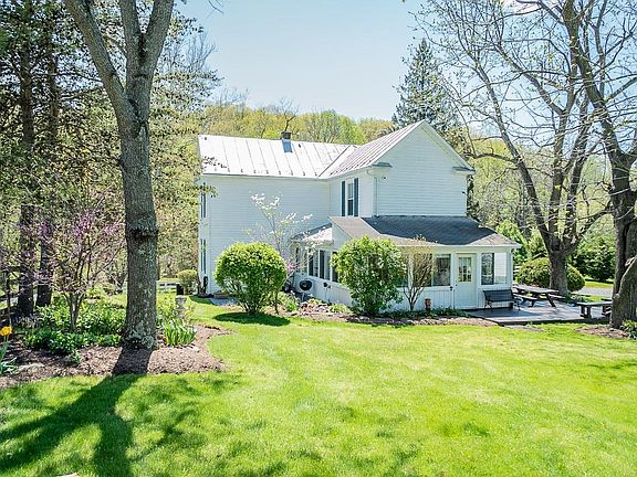 A lit bit country, a whole lot of soul! Take a step back in time to a more quiet and quaint lifestyle. Many period features grace this lovely turn of the century farm house. Enjoy the lush mature landscaping and serene outdoor spaces in this mostly fenced yard - a large patio and deck for entertaining, garden area; meditative koi pond, 12x28 Workshop w/electric and 24x24 Garage. Inside, a sweet period Kitchen offers many charming details and built-ins. A fun four-season porch is ready for entertainment. First floor laundry and potential to use the parlor as a Bedroom. Two additional Bedrooms, full bath and nursery/storage rooms upstairs. Be lulled to sleep listening to rain on the metal roof, or snuggle by the cozy woodstove.. embrace the simple things in life!