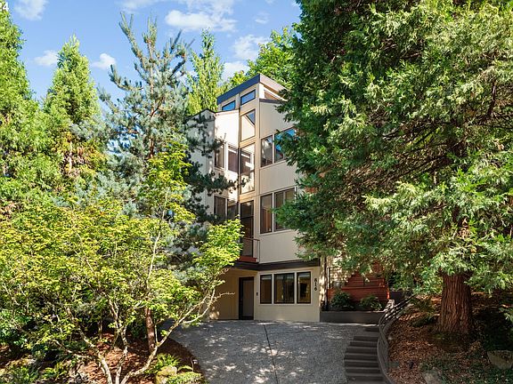 Immerse yourself in nature while enjoying NW Contemporary living at it's finest. Walls of windows let light and nature in while warm wood and exquisite details abound throughout the interior of this exquisite home. High-ceilings carry into the atrium style staircase with prairie windows at the apex. This home truly shines. The living room and library meld into each other and the ambiance of the gas fireplace warms the room. Beautifully modern kitchen with walls of cabinets, built-in dining, and stainless gas appliances including a Dacor range. Entertain in style in the dining room that flows out onto the patio for dining al fresco. Primary suite plus 2 additional beds up...one with a loft, all have high ceilings. The lower level is perfect for an home office/gym/guest space with a full bath and laundry area. There is a 1-car enclosed garage along with a carport. New roof in '23 w/ 25yr warranty too. Tucked into the Hillsdale neighborhood and close to the city, shopping and dining, OHSU, parks, and SW trails. [Home Energy Score = 2. HES Report at https://rpt.greenbuildingregistry.com/hes/OR10203153]