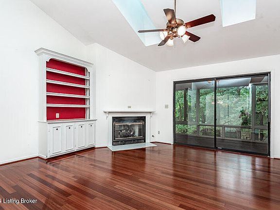 The living room has beautiful wood floors, built in bookcases and a gas fireplace.