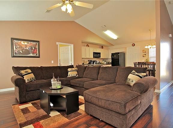 Cul-de-sac lot and move-in ready 3 bedroom 2 bath featuring laminate hardwood floors throughout, an open living room with fireplace and eat-it kitchen with bar, cozy master suite with double vanities and spacious backyard!