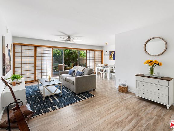 Tucked away in a quiet, gated community with lush landscaping and sparkling pools in a parklike setting, this tastefully updated mid-century townhome truly feels like a retreat from the city. Sliding doors span the entire length of the open living/dining room, providing amazing natural light and indoor-outdoor flow for entertaining or playing with kids and fury family members in the huge, private yard. The fully updated kitchen, with Quartz countertops and stainless-steel appliances, faces out toward a charming rose-lined walkway. The sunny, spacious primary boasts a tastefully remodeled en-suite bath with dual sinks, two large closets and a vanity station with a hint of Golden Age Hollywood glamour. The sizeable and bright second bedroom features a charming built-in desk and ample closet space as well. In the hallway, you'll find a second beautifully updated bath, linen closet, large walk-in closet and laundry room with additional storage. The private, attached 2-car garage with direct access makes loading and unloading a breeze. With no one above or below, only one shared wall and single-family houses just over the fence, this single-story, corner end unit really feels like a home. Please stop by one of our open houses this weekend!