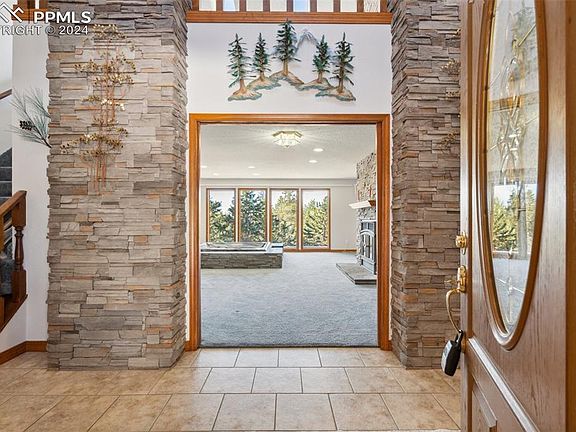 Peaceful tranquility will surround you in this lovely 4 bedroom, 3 bath home nestled on a 7.7-acre treed lot w MOUNTAIN VIEWS! A 4-car tandem garage is attached to the home w addt'l protected parking available in the shop close by. A dramatic 2-story entryway, boasting a beautiful stone wall, greets you as you step inside this wonderful home. Open the foyer's pocket doors to enter the family room where you can enjoy the warmth of a stone gas fireplace and relaxing times in the hot tub. You can step outside onto the huge, covered patio from the family room. The main level also includes 3 bedrooms, 2 baths, an office & laundry. From the foyer, you'll climb the staircase to the upper level where you'll be amazed by the huge, open living area. The living room focal point is a stone wall with gas fireplace, while the welcoming eat-in/country kitchen, offering unbelievable views of Pikes Peak and highlighted w a wall of stone, is a cook's delight! The many cupboards and pantry, ample granite countertops/backsplash, downdraft range, trash compactor and SS appliances will make your time in the kitchen a joy. The upper level includes the master retreat which features a large bedroom and 5-pc bath beyond French doors. The bath boasts a spacious double vanity with granite counter, soaking tub and tiled shower. Access the walk-around deck from the master suite or the living area, where you will marvel at the spectacular mountain views while basking in the great Colorado weather. This home has 2 central A/C units, 80-gal water heater, whole house generator, new roof and gutters 07/23 and solar shades. A shop, 30x16 with 12x12 door, is close by and includes 30-amp electric. You can park your RV and store so much more inside! A 2nd drive-thru metal shop, 40x30 with 2 doors -10x10/ea, is accessible from Juniper Road. The circular asphalt driveway will be appreciated. Your entire family and pets (horses, too) will love this beautiful, serene property abounding w Ponderosa Pines.