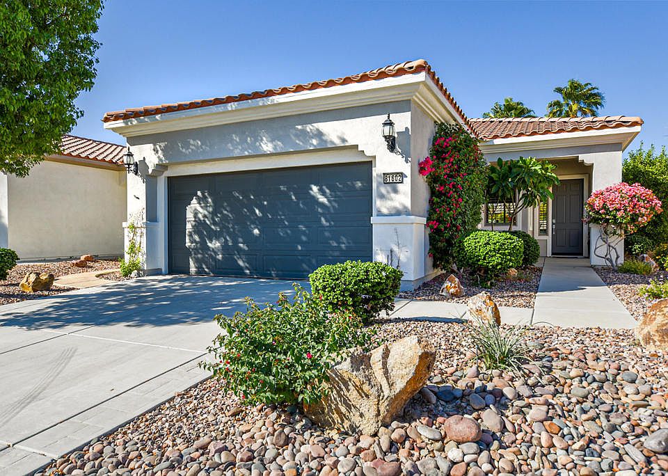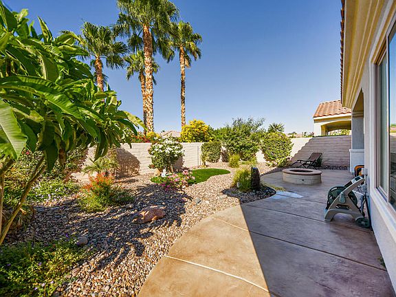 An extraordinary 1257 SF(EST.) 2 BR, 2 BA Canterra plan situated inside the 24 hour gate guarded , 55+ community of Sun City Shadow Hills. This is resort style living at its finest with two 18 hole golf courses, 2 club houses, 3 swimming pools, 2 fitness centers, social clubs, tennis, bocce ball, view restaurant, low HOA's and 30 minutes to the Palm Springs Airport. The exterior of the home was just painted to a new, smashing modern look! An added walk leads from the driveway to the backyard. The interior has modern tile & wood-look laminate flooring throughout, plantation shutters on all windows, recessed lights and 5 lighted fans on soaring ceilings. There is space for in-kitchen dining as well as a wraparound stool height breakfast bar where guests love to hang out. Also granite countertops, 42 inch quality cabinets and stainless steel appliances. The open great room has a formal dining area and a wall of glass view to the covered patio and beyond. The primary king-size bedroom suite has dual vanities, a step-in shower and an organized walk-in closet. Across the home is the guest bedroom, bath with a shower over the tub & the finished laundry room. Real AC and storage in the garage. You'll love the gorgeous patio w/fire pit, water feature and patch of artificial grass. More!