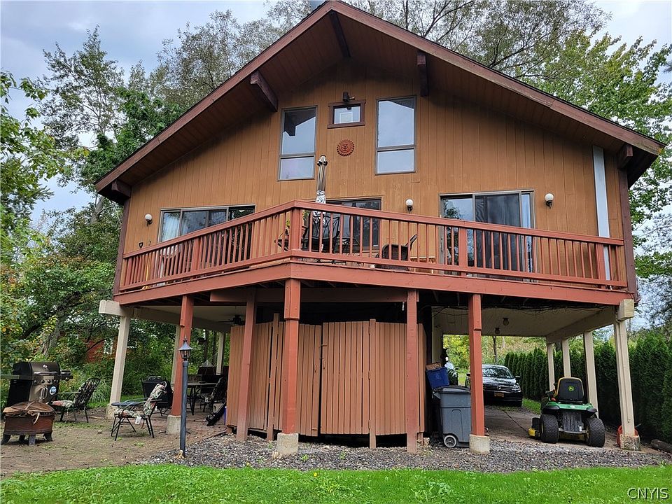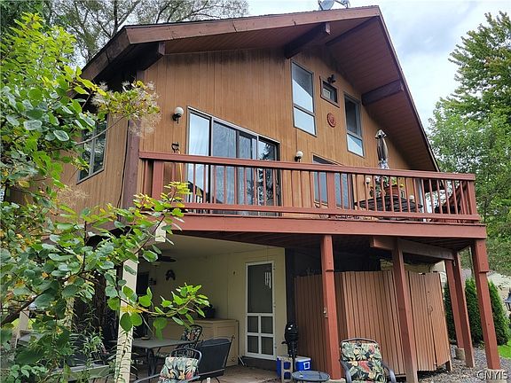 DFT - Can close quickly! Oneida Lake Deepwater Access! Contemporary waterfront retreat offering 75 foot deep water access (on Chittenango Creek) to Oneida Lake. Great 2nd home/summer house with year round useability! Unique home offers three levels with balconies overlooking the wooded private waterfront. The main level has 2nd kitchen area and extensive patios for entertaining. Open concept main living area with vaulted and beamed ceilings plus 2 bedrooms & 1 bath, third level has master en suite with loft area, balcony and built in bed. Prime location in CNS school district yet a short drive to major highways (15 min to SU and Downtown). Sail or boat anywhere from your backyard! **New deck, interior painting and new HVAC installed early summer 2019 plus new second stove and fridge and hot tub! Alos listed for rent: S1452244