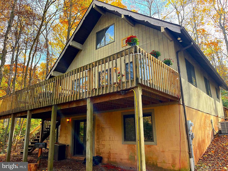 Rustic charm in a cozy private setting! Wild life abounds in this wooded 2+ acre lot, and can be seen at every angle from the huge wrap around deck. First floor boasts hardwood floors, large living room with stone fireplace for those chilly fall evenings, galley style kitchen with dining area and large pantry, and a large bedroom and full bath. Second floor includes 2 additional bedrooms and a full bath. Bring your finishing touches to the family room in the basement which includes a wood stove for additional heating and a built-in bar area. Plenty of parking, too! A little paint and sweat equity will go a long way in making this hideaway shine again!