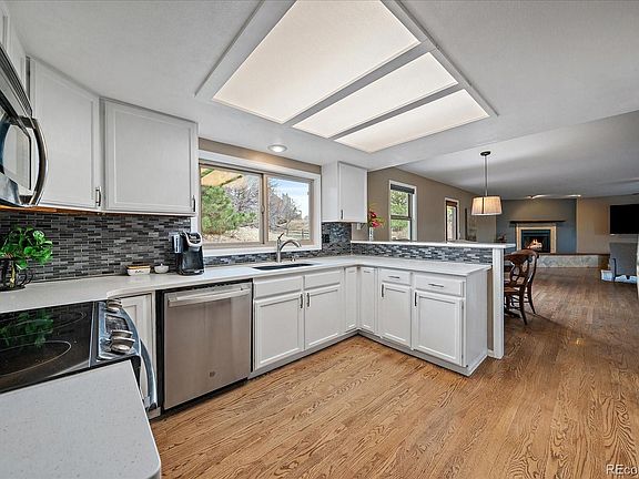 This is one of those homes that just feels right the moment you arrive. Tucked on a quiet street only two blocks from Bingham Lake & Park, offers rare privacy, sweeping mountain views, and a calm, everyday connection to nature that’s hard to find. Inside the home is light, open & thoughtfully updated with stylish designer finishes throughout. Two AC units (primary and dining) add comfort combined with baseboard water heat the reduce allergens. The kitchen is the heart of the home, featuring crisp white cabinetry, quartz countertops, stainless steel appliances & pantry—perfect for both daily living and hosting friends. Hardwood floors flow across the main level into a spacious family room where a cozy fireplace and wall of windows frame beautiful outdoor views. Formal dining room adds even more space to gather. Upstairs, the expansive primary suite is a true retreat. Step out onto your private balcony to take in the mountain views, unwind in the luxurious five-piece bath. Laundry room is impressively large with built-in cabinetry, 2nd pantry & hanging rod—functional and refreshingly practical. Finished basement offers 2 bedrooms & ¾ bath ideal for guests, home office or flex space. Generous storage or room for a home gym. Outside, you’ll love having three separate decks perfect for morning coffee, evening sunsets, or quiet weekends at home. Little traffic in front of the house, the setting feels peaceful & removed yet just moments from the lake & park. Recent upgrades include roof (2022), garage doors (2025), fresh exterior paint (2025) & radon mitigation system already in place. LOW property taxes (unincorporated Parker), plus savings on sales tax for everyday purchases. As a Pinery resident, you even have access to RV parking for just $35/month. This home blends comfort, privacy & scenic beauty in a way that’s increasingly hard to find—don’t be surprised if it’s gone quickly. Make sure to checkout the indoor drone video! https://youtu.be/Q65MFPXemTo