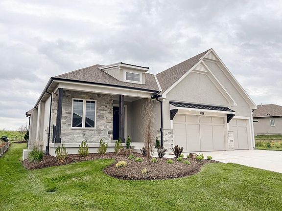Step into the popular Augusta, a Reverse 1.5-Story by J.S. Robinson Fine Homes on Lot 19 in Bristol Highlands Villas - an exceptional 4 bedroom, 3 bath home with a 3-car garage. NOW AT AN INCREDIBLE NEW PRICE! This stunning home features a gourmet kitchen with custom cabinets, designer tile, sizable island, upgraded quartz countertops, 5-burner gas range, large walk-in pantry, and soft-close doors & drawers! The great room boasts a cathedral ceiling, dramatic ridge beam, wall of windows, and gas fireplace, creating warmth within a light and open space - perfect for entertaining or just enjoying family time! Relax in your luxurious primary suite with a soaking tub, walk-in tiled shower, quartz double vanity - conveniently connected to a large walk-in closet and laundry room. A finished lower level features a large recreation room with a walk-up bar and space for a refrigerator - wonderful space for entertaining! The lower level also includes two bedrooms with a shared bath, and ample unfinished space for storage. House guests will feel pampered with their own private space! Enjoy a vaulted, covered patio out back while you take advantage of the maintenance-provided convenience of lawn care, irrigation system maintenance, and snow removal. Bristol Highlands is just minutes from Lenexa City Center, Shawnee Mission Park, Lake Lenexa, several golf courses, trails, and a wide array of shopping and dining choices. Villa homeowners have the option to join the Bristol Highlands Community Clubhouse, Pool, and Pickleball Courts. Don't miss this opportunity for convenient living on all levels! Come enjoy the carefree lifestyle you deserve! This home is move-in ready now!