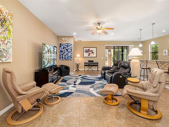 Breakfast barAbundant natural lightHigh ceilingsLight-filled three-bedroom two-bath residenceScreened paver-extended lanaiInviting open layoutKitchen features ample cabinetry