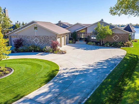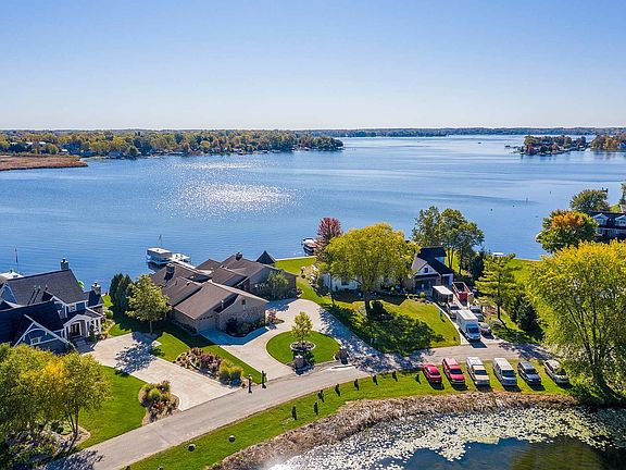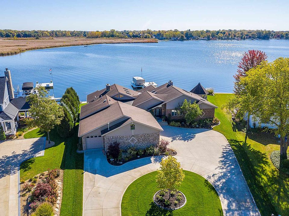 PIER 143-K175. This private and peaceful location on the shore of Johnson's Bay comes with an unobstructed view of nature across the bay. The yard gently slopes to the lake so there are no stairs to climb! The only stairs you will have is to the bunk room. This updated rare and stately ranch offers one level living with five bedrooms, four and half bathrooms, one home office, four car garage with workshop area, and a large bunk room above the garage. As soon as you walk into the home you are greeted by the stunning lake view, high ceilings throughout, beautiful hardwood flooring and sun light coming through the many large windows and skylights. The large kitchen features a center island, stainless steel appliances, wine fridge and numerous cabinets for storage. The kitchen openly flows into the great room with its floor to ceiling gas fireplace and dining area. The master bedroom offers stunning lake views through the massive windows and a beautiful master bath featuring double vanities, soaker tub and a large tiled shower. This home has a lovely four-seasons room with stone flooring and doors leading you to a wonderful maintenance free deck with retractable awning. As you walk out onto the deck you will also find a fabulous gazebo attached overlooking the lake.