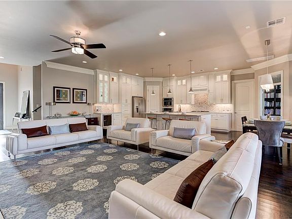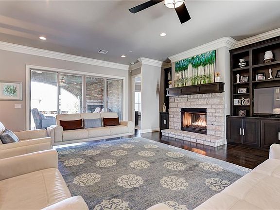This soft contemporary home has a fabulous open floor plan and is located in north Edmond in Twin Bridges. It has 4 bedrooms, 3.5 baths, a dedicated study, and an amazing spacious kitchen open to the dining and living areas. The elegance is astonishing. You will find nail down wood floors, crown moulding, wood built-ins throughout, 10 ft. ceilings and contemporary tile work. In the kitchen counter space abounds - featuring a huge eat-in island, gas cooktop, wine refrigerator & a walk-in pantry! The living area opens to a large covered patio with a commercial grill & refrigerator along with a huge flat backyard. The Master suite has a coffered ceiling and includes a sitting area, an en-suite bath with a whirlpool tub, two vanities, a beautiful stand-up shower and a spacious closet. Upstairs is a spacious game room with a wet bar/microwave and the fourth bedroom with a full bath. Twin Bridges living includes K-12 Edmond schools. HOA amenities: Clubhouse, fitness center, and pool!