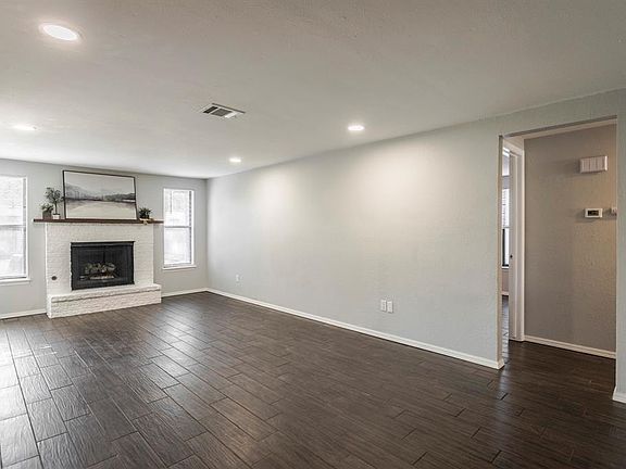 Step inside to find gorgeous dark wood-look tile flooring that runs throughout the entire home. The spacious living room features recessed lighting and a charming brick fireplace with gas logs—ideal for cozy nights in.