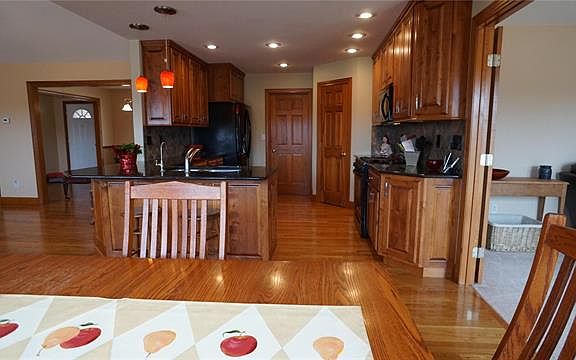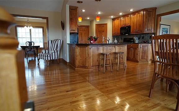 This lovely 4 bedroom, 3 bath home features a renovated kitchen and bathrooms with custom cabinetry. Full walk-out basement, 3 car garage, half-circle driveway, covered front porch, two decks, and a spacious patio. The main level features wood floors throughout the kitchen, eat-in kitchen, dining room, living room, and foyer. French doors bring you into the spacious sitting room/den and access to one of the two decks. Three bedrooms are conveniently located on the main floor. The master bedroom suite has a beautiful tub and walk-in shower and provides access to the second deck. The lower level is incredibly spacious! A fourth large bedroom, full bathroom, office, storage area, safe room, and family room will suit all of your needs.