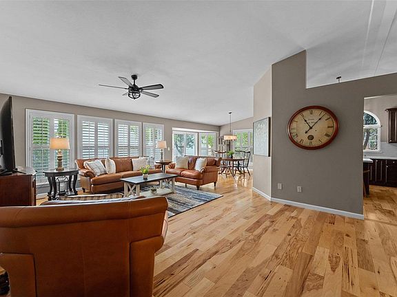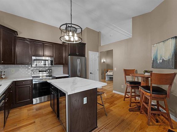 Main floor living at its best in this sought after Winghaven community with 1,819 sq ft! Hardwood floors welcome you in the entry foyer into the spacious great room with vaulted ceiling and large windows offerings TONS of natural light. The eat-in kitchen boasts custom cabinetry, tile backsplash, granite counters, stainless appliances, center island with breakfast bar, and pantry. Separate dining just steps away with access to the sliding doors leading to the oversized patio with some privacy. The master suite features dual sinks, a large shower, & walk-in closet. The additional bedroom accesses the full hall bath. The main floor laundry room provides access to the oversized two car garage. The lower level is expansive providing lots of storage and ready to be finished for additional living space! Other features include: refrigerator, washer & dryer included, ceiling fans, plantation shutters, fresh paint, and more! Welcome Home!