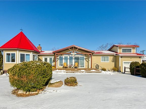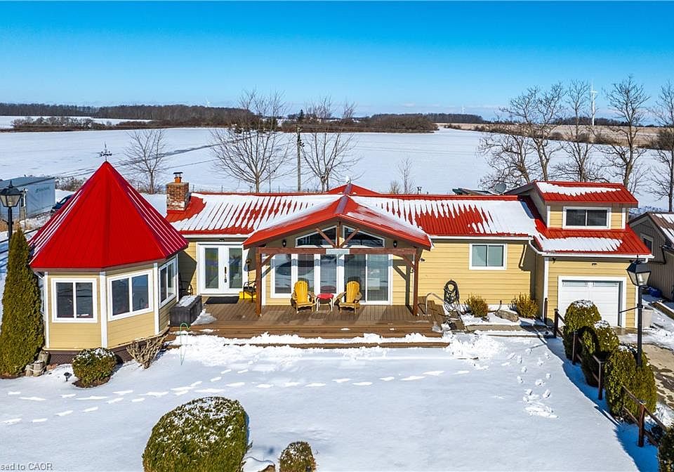 Imagine living in this exquisite 3-bedrm chalet-style home, right across from Lake Erie's beautiful shores! With a rare 0.47-acre L-shaped lot and 100 ft of frontage, you'll have stunning lake views and a fantastic sand beach just a short stroll away. This place is all about relaxation, recreation, and creating unforgettable memories. Inside, enjoy luxurious upgrades, vaulted ceilings, a cozy wood stove fireplace, and charming wood beams. The open-concept main floor offers breathtaking lake views, a custom kitchen with quartz counters, and a spa-like bathroom. The principal bedroom retreat even has a home office with fiber-optic hi-speed internet for all the hardworking professionals out there. Plus, the lower level includes a comfy family room, convenient 2pc powder room, and laundry closet. Step outside to the south-facing deck and take in the panoramic water views from the beautiful turret top gazebo. Park your vehicles and boat or RV in the attached garage, concrete driveway, or the bonus gravel parking lot with 2 large truck-box containers for storage. You can potentially build a 1,000 sqft secondary suite/bunkie/rental unit, subject to Haldimand County requirements. The shoreline across the road is protected by a break-wall owned and maintained by Haldimand County. Located just 20 mins from Dunnville and the hospital, and only a 1-1.5hr drive from Hamilton, Niagara, and Toronto. Don't let this amazing opportunity to embrace the Lake Erie lifestyle slip away. Fishing, boating, bonfires, and so much more await you!