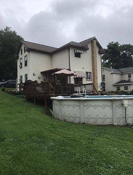 Home in quiet neighborhood with 3 large bedrooms, two family/living rooms,spacious mud room,detached 2 car garage which is heated with hard coal boiler that heats house also.Gas fireplace and just added oil hot water boiler for heating flex ability. 2 decks, swimming pool and 12x12 shed with concrete floor. And a 27x7 heated front porch remodeled outside just waiting to be finished inside to whatever is desired inside.