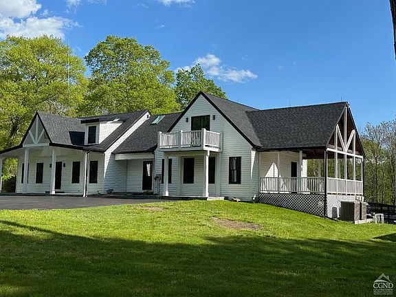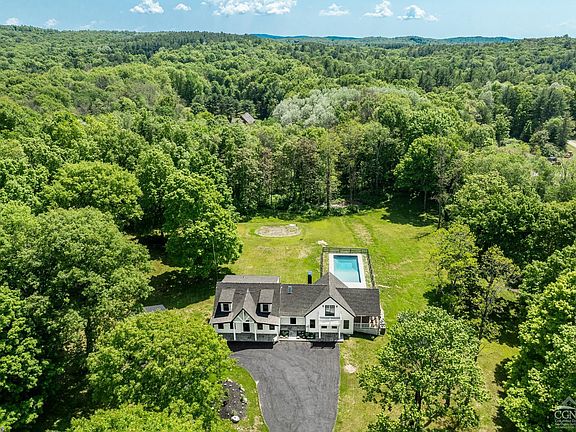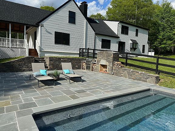 Millbrook Country House. Located just outside the village on a beautiful rural road is this completely renovated 3,318 square foot home accessed through beautiful stone pillared gates. There is a solar heated, 18' x 40' inground saltwater pool with three steps that span the width of the pool, a perfect place for lounging in the water. Offering four bedrooms and three full and two half baths with oak floors throughout, the home has an abundance of space for living and entertaining and a beautiful flow between spaces. The great room opens to the sitting room with fireplace, living room and kitchen featuring quartz counters, center island with seating and access to a bluestone terrace for alfresco dining. There is also a formal dining room and mudroom. A guest wing provides a first floor bedroom, full bath, office, and a room with access to the 14' x 20' cathedral porch. Upstairs houses the cathedral primary bedroom with beamed ceilings and balcony includes the primary bath with double sinks, free standing tub and walk-in shower. There are two additional bedrooms with a shared bath. The basement has a 31' x 26' finished room with a powder room, for endless possibilities. Sited on 5-acres, the property features a beautiful space for outdoor living. An expansive bluestone patio surrounds the pool and includes a built-in grill and fireplace. Truly a wonderful home for indoor and outdoor entertaining. A 2-car detached garage adds to the amenities. The perfect rural location while being close to the Village of Millbrook and 20 minutes to Rhinebeck.