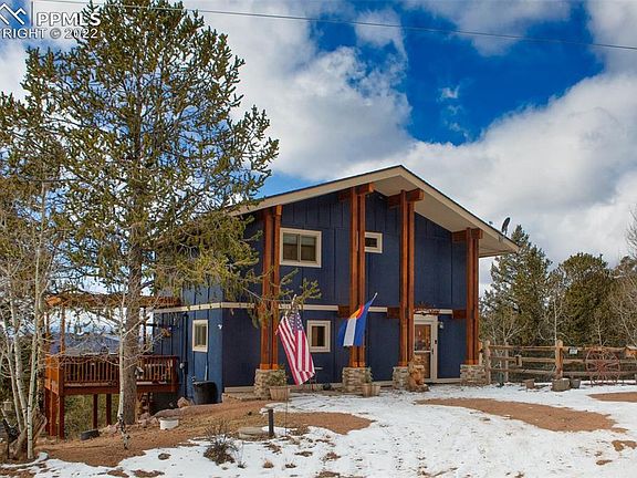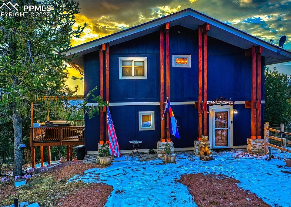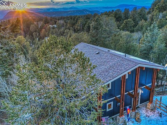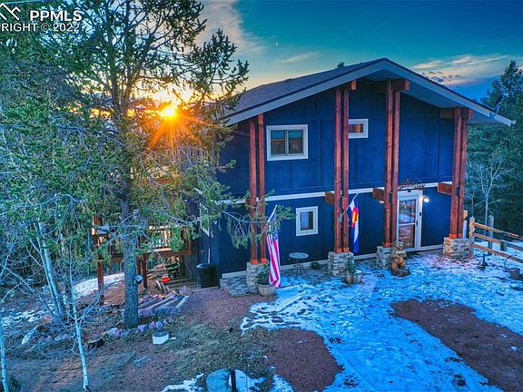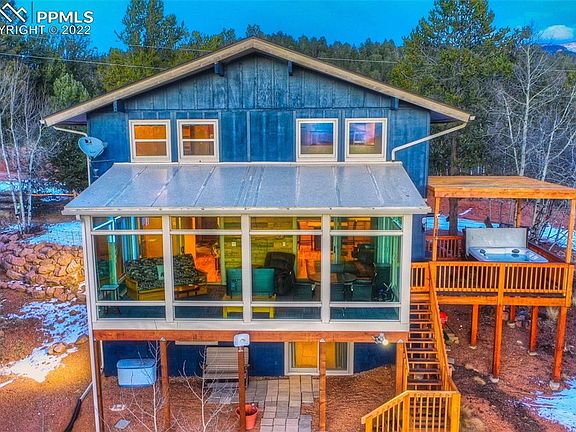 This lovely home, ideally situated at an elevation to provide captivating mountain views, is one of the best in Cripple Creek Mountain Estates! The comfortable main floor layout has a welcoming tiled entry with a full bath that leads to a dining room, kitchen, living room (all featuring hardwood floors), and large sunroom. The kitchen is updated with appealing granite countertops and newer stainless appliances. Enjoy relaxing in the living room with its efficient pellet stove, airy vaulted ceilings, and nicely open layout to the kitchen. The dining and living rooms each have sliding doors that lead to a year round sunroom whose windows showcase the best of Rocky Mountain living. Endless hours can be spent watching the wildlife and magnificent mountain views from this wonderful space. It leads to a side porch with a hot tub that will draw you into dreaming of a soak while watching the gorgeous Colorado sunsets. Upstairs are two bedrooms, one being the master suite. The master bath features a soaking tub, dual vanities, a shower, in floor heat, and large walk in closet that was recently remodeled and expanded. The lower level of the home has two other spaces perfect as an additional living room, guest room, or office with a gas fireplace and also a convenient walkout to the back yard. There are two separate large storage rooms there, one with the laundry facilities. This lot feels very spacious with good privacy. It is well designed with a new boulder retaining wall, dog run/fenced area, and a 12x20 storage shed. The hot tub deck has stairs to access the fenced back yard space. The location is easy to access (only a few minutes off of Teller 1) and is near some of the best attractions in Teller County. Only 15 minutes to Cripple Creek, 20 to Florissant, 40 to Woodland Park. A fabulous home for anyone looking to live full time, part time, or share with others. Don't miss it!