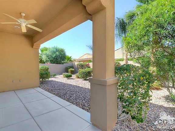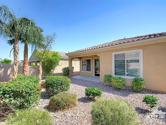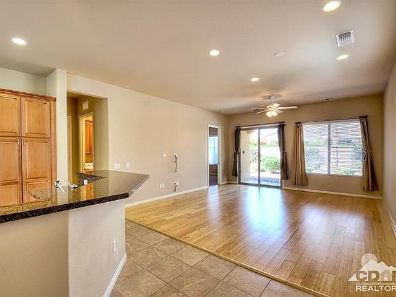 A spotless clean and well maintained Canterra model built to 1257 SF (est.) in 2008. This home features a beautiful kitchen with dark granite counter tops, stainless steel appliances including refrigerator, quality cabinets with lower roll-out shelves and a stool height breakfast bar. There is tile in all the walk areas and carpet in the bedrooms. The great room has gorgeous blond wood flooring that is bright, cheerful and inviting. The large master suite has dual vanities, glass enclosed shower and generous walk-in closet. There are shutters, lighted ceiling fans and drapes over window blinds. The laundry room has a deep tub, storage cabinets above and below, folding counter and washer/dryer. The rear covered patio is quiet and peaceful. There is deluxe, mature, desert landscape including palms. Everything is readied for an easy move-in. The home is priced realistically; the value is evident.