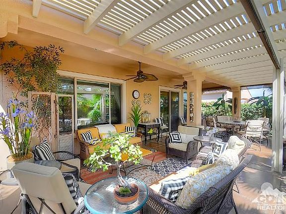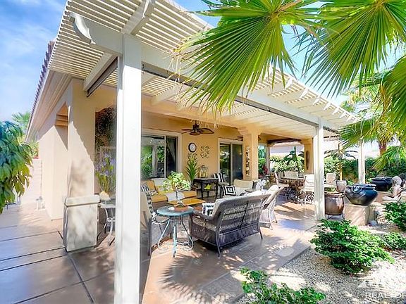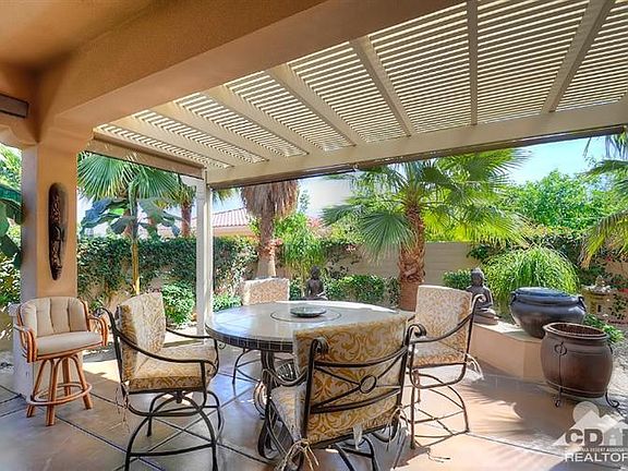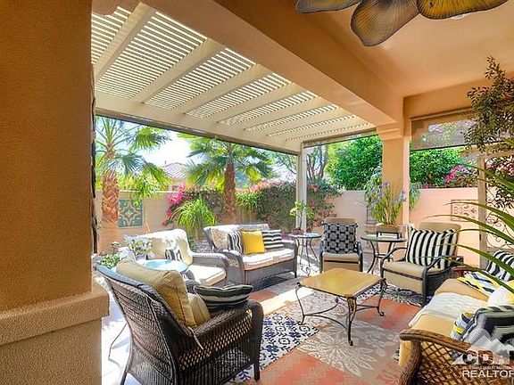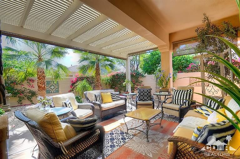 An exceptional Serrente model, with South facing patio, built to 1488 SF (est.) in 2008. There is a metal gate leading to the front enclosed, and private, courtyard that has Alumawood cover above and space for relaxing. The South facing patio deck was extended with concrete and above an enormous amount of Alumawood was added to transform this area into a spectacular, fully covered, out-door living room and dining room. You are surrounded by lush tropical landscape including palm trees and two water features. This home maximizes the open air experience. Inside has tile everywhere except the bedrooms, beautiful drapes, silhouettes, arched valances, ceiling fans and recessed lighting. The kitchen has an extended island w/granite counter top, quality cabinets with lower roll-out shelves, and stainless steel appliances. The large master suite has glass shower and walk-in closet. Also, a den, 2nd bedroom & bath, utility room. A sidewalk connects driveway to patio. The garage has insulation