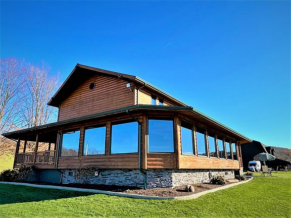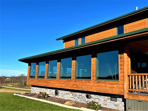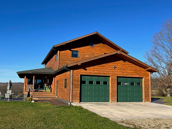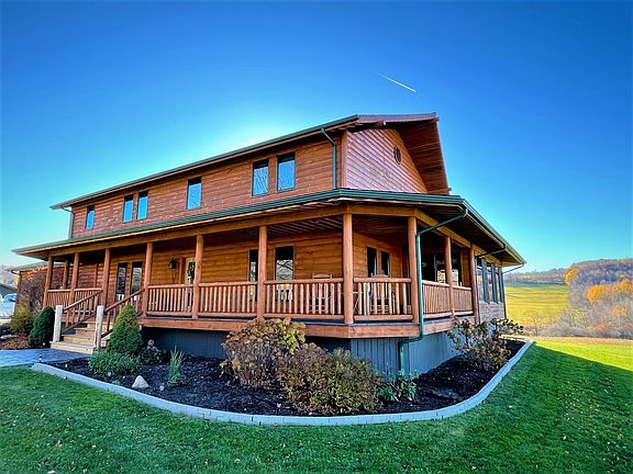 Whitetail Properties is pleased to present a spectacular hilltop dream home with panoramic views in Rushford, NY. Retreat to this one-of-a-kind log-sided home and relax, basking in sunrises and sunsets every day. This open concept caber constructed home boasts an airy "outside but you're inside" expression with nature having the home's north, west and southern exposures of the home constructed with ten nearly floor-to-ceiling, Anderson brand picture windows. From all lower-level common rooms, you can see the farm, the hills, the fall color, and observe deer, turkey, fox, eagles and the evening moon and stars. The home has four bedrooms, four bathrooms and a fully finished basement for extra living space. The jewel of the second floor is a very large and luxurious owner's suite and bathroom. Each bedroom features casement windows too. There is a two-car attached garage with 11' + ceilings. This country sanctuary also has a one-acre pond stocked with bass, catfish, crappie and sunfish is a place to further enjoy wetting a line or observing ducks, geese, mink and the occasional Blue Heron. Lovingly manicured, the poured and stamped concrete walkways are also home to a beautiful array of flower gardens, planted pots and ornamental pear, redbud maple and quaking aspen trees, havens for butterflies, hummingbirds, and northeastern songbirds around the house to enjoy. On the south side of the home is a very large and well-pointed 38 x 50 barn with a 12 x 48 lean-to. Inside is a concrete center pad having three 12 x 12 stalls, a large 12 x 36 pen stall, split doors, and a hay mow above with four dormer windows and serviced with water and electric--a comfortable place for horses, a couple of cows or a light animal hobby farm home. The property is expansive at nearly 100 acres and actually has its own valley. On the near side of the valley, you will find a large pasture field fenced with high tensile wire. On the opposite side of the valley, you will find a western pasture with an adorable cabin with a porch and a perfect place for a campfire to enjoy an evening overlooking the farm or use as a deluxe hunting cabin during deer season. A small creek meanders through the bottom of the valley where food plots are located, and proximate to the house, a tillable corn field is in production of about 19 acres. This property is centrally located, only 1 hour to Buffalo, 1.5 hours to Rochester, 1.5 hours to Corning, 10 miles to Houghton University, 30 minutes to St Bonaventure University, and convenient to nearby Lakes, Ski resorts, Golf courses and Letchworth State Park. Priced well to sell, don't let this one go by! Call today.DIMENSIONS:Kitchen: 24'8 x 13'8Dining Room: 20'5 x 24'8Den: 12'8 x 18'2Foyer: 10' x 13'Bath ½: 5'2 x 4'3Laundry: 12'9 x 6'9Bedroom/Office: 12' x 13'Owners suite: 18' x 26'5Owners bathroom: 13'2 x 9'3Bedroom 2: 16'5 x 12'9Bedroom 3: 10'6 x 14'Bedroom 4: 12'9 x 10'8Bathroom up: 9'3 x 7'8Garage Attached: 29'5 x 25'Oversized garage doorsRoad frontage: 1,780'Lot E/W: 2,516'Lot N/S: 1,721'