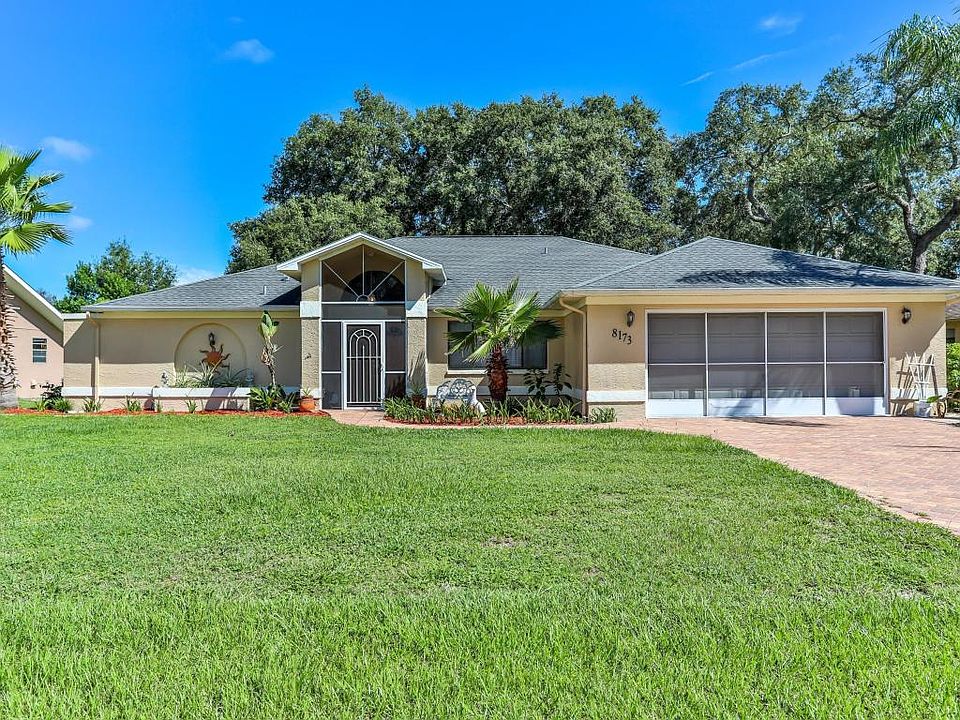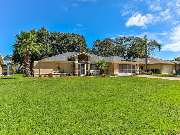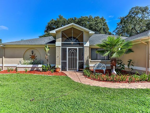 This beautiful home sits on a generously sized lot in Berkeley Manor where the hoa fee is optional. The screened entry leads you thru the double doors opening up to the spacious great room, dining room to your right, kitchen with breakfast bar and a flex room that could be used as a breakfast room, or add french doors and make it an office/den. The 3 bedrooms are of split design providing privacy for the master suite which features dual sinks, separate tub and shower, a vanity section, walk in closet and sliding doors to the lanai. Enjoy Florida living out on the beautiful brick paved lanai and swim year round in the heated and screened inground pool. An additional covered patio area could be a private oasis. Keep the mess outside, 2nd bathroom has pool access. A/C 2014. Roof 2006.