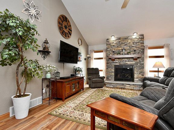 Step inside this beautiful ranch style home and you are sure to fall in love with the open concept living area with an authentic masonry gas fireplace and vaulted ceilings, an open staircase, spacious kitchen with newer black stainless appliances with smart features, dining area with doors that go out to the covered deck. The main floor also features a nice sized primary bedroom with tray ceiling and a private bath with a walk-in shower, 2 additional bedrooms, a second full bathroom, laundry room with 1/2 bath, and separate entry area from garage. The lower level includes a large family room, 2 additional bedrooms, a full bathroom and nice storage space. A fenced yard, patio, storage shed and a 2 car garage with painted floor and new doors complete the package. Schedule your private showing today!