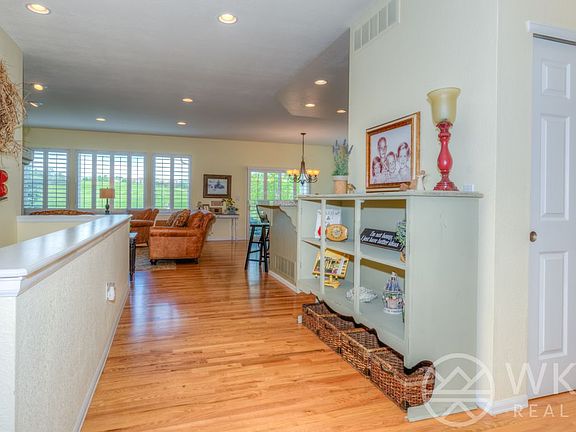 On the 2nd hole at HEBGC! Adorable ranch with extensive hardwood on main floor and plantation shutters. Kitchen is stainless with gas cooktop, double oven & large pantry. Master with coved ceiling and 5-piece bath. Guest rm and bath on main also. Enter from garage into shared office/laundry with shutters. Basement has lovely game/great room and tons of storage room. Back patio has Sunsetter retractable awning and yard has fenced area. This is just darling!
