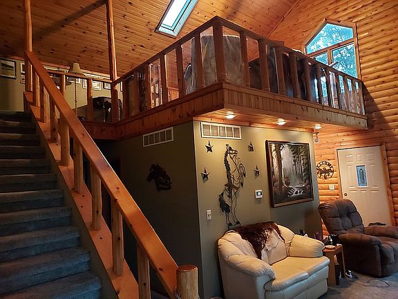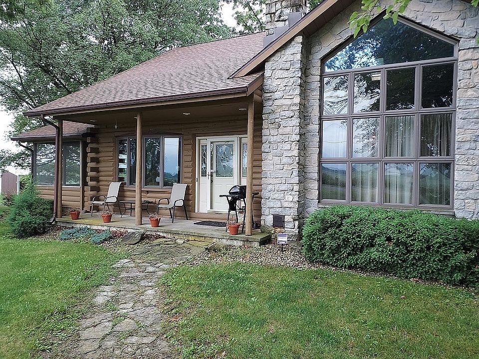 Hey, its only 5 minutes from Indian Lake! Log cabin home, on nearly 6 acres, lots of shade, real stone trim on the front 2 story window, leaded glass door, loft area, downstairs master with rear deck, glass block bathroom windows, 2 sky lights, wood burner, screened side porch, covered front entryway, poured concrete basement with drive in, security system, almost new furnace and architectural shingles, roomy 2 car garage with storage shelving, barn is center isle with 4 oak stalls, 3 pasture shelter sheds, lean to, small indoor riding arena, outdoor all weather stone dust riding track, small hay mow, feed or tack room, 5 paddocks and horseshoe driveway. Zillow does not recognize acreage, barns, sheds or upgraded fencing in Zillow estimate. Willing to pay buyer's real estate agent 3% commission.