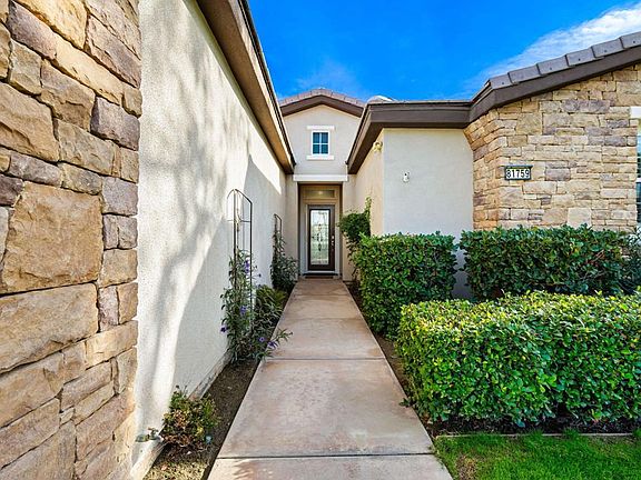 Exquisitely upgraded Maree plan located behind the private gates of the prestigious Trilogy La Quinta, a premier 55+ resort-style community. Perfectly situated on the 12th fairway of The Golf Club at La Quinta, this stunning residence showcases spectacular southern mountain, golf course, and spa views. Offering 1,771 sq. ft. of beautifully designed open-concept living space, the home features 3 bedrooms, 2 bathrooms, dual patios, and an abundance of natural light throughout. The charming Tuscan facade and custom glass-etched entry door set the tone for the refined interiors, where plank flooring flows seamlessly through the great room highlighted by a sleek tile-encased gas fireplace with mantel and media niche. The adjacent dining area opens to a chef's kitchen appointed with stainless steel appliances, built-in double ovens, microwave, prep island with bar seating, dazzling quartz countertops, custom tile backsplash, crisp white cabinetry, and a convenient pantry. The spacious primary suite is a private retreat with plantation shutters, a generous walk-in closet, and a spa-inspired en suite bath featuring dual vanities, quartz counters, and a stunning floor-to-ceiling tiled shower with frameless glass enclosure. Perfect for hosting guests, the additional bedrooms offer comfort and flexibility, complemented by a separate laundry room for convenience. The entertainer's backyard is an absolute showpiece, boasting a pergola-covered patio, a luxurious in-ground Pebble Tec spa with Tuscan stone surround and dual water descents--all framing the breathtaking panoramic golf and mountain views that define desert resort living at its finest.