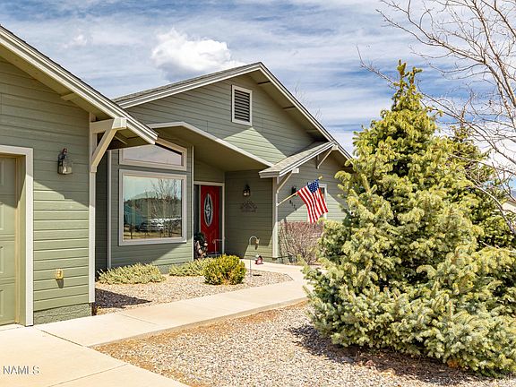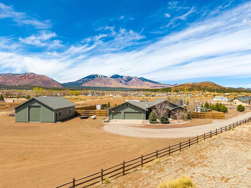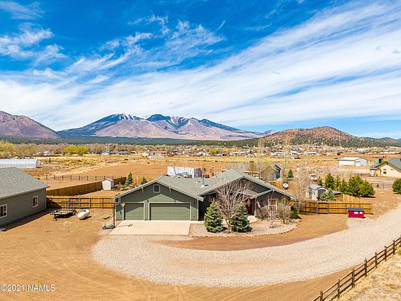 Spacious custom built 4-bedroom 2 bath open floor plan home located at the end of a quiet cul de sac. Watch the weather roll in with fabulous mountain views of Mt. Elden and the San Francisco Peaks. This home features two living areas with both a great room and family room, 2 wood burning stoves, built in bar/hutch and desk area, large master with his/her closets, A/C, huge patio, side patio with hot tub, garden area, and 2 sheds. Plenty of room for animals and/or toys on 2.5 acres with 3 car garage and 30X45 RV Garage/Workshop. Property is fenced with a privacy fence that surrounds the immediate backyard. Has an additional fenced area which could be used as an animal/dog run. Seller is offering a $5,000 flooring allowance for buyer to choose their own flooring.