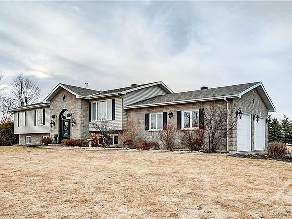 Standing proud on a beautiful 2-acre property is this stunning high ranch located just 15 minutes from Kanata. A grand stone facade welcomes you home! While inside, an elegant layout awaits with a large living room warmed by a fireplace and beautiful hardwood floors underfoot. The custom kitchen + dining room enjoy easy-care tiled floors, stainless steel appliances, plenty of storage, large centre island, beautiful granite counters w/ access to the rear deck. Three bedrooms are on the main level, including a master retreat withensuite/walk-in closet. Downstairs, you will find 3 additional bedrooms, 3 pc bath, rec room, laundry/storage. When it's time to relax, there's a tiered deck + lower gazebo covering a hot tub. An oversized garage and 2 detached sheds are also on offer and there are beautiful countryside views to enjoy day and evening. Roof (2020).