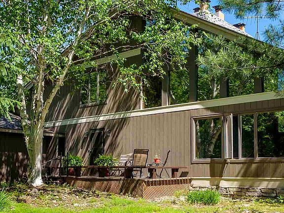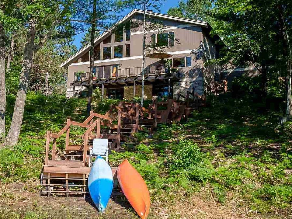 EAGLE LAKE!! Beautiful custom home on 363 feet of private frontage and 2.6 acres. Vaulted ceilings with two stories of windows pull in fabulous views of Eagle Lake. Massive fireplace and living room. Easy access to your waterfront, beautiful deck spanning the entire front of house and walkout lower level. 3 BR, 2.5 B, 3 fireplaces, beautiful updates to bath and bedrooms including Bamboo floors. Massive kitchen with built-ins, 2 garages, and family room with walkout in the basement. Totally natural low maintenance yard, with updates to roof and siding. Blacktop road, natural gas and high speed internet. State land across the lake and easy access to Blue Bear Trail. Turn key potential. This home provides a unique opportunity to relax, hunt, fish and entertain.