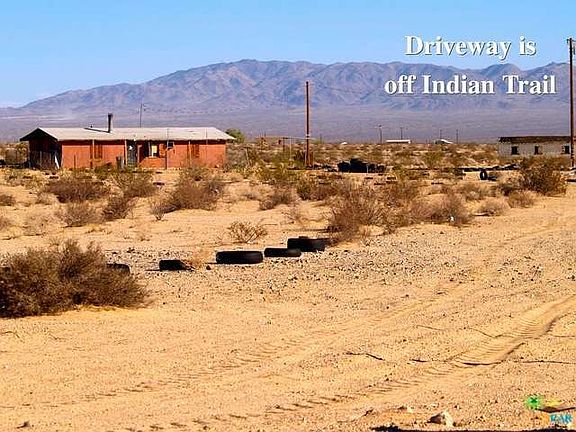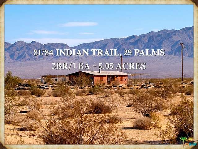 81784 INDIAN TRAIL - This is a 4 Bedroom 1080sf w/Living Room + 1 Full Bath House on 5.05 Acres. Built in 1959 but remodeled and enlarged in 1986 according to records. NICE wood burning fireplace in the living room. Kitchen has large open dining area with lots of built-in shelving. Outside has partial fencing around the land and a carport. Once upon a time this was a farm and they used the tires on the property for plant holders and made trails around the property. I imaging lining up the tires and making a awesome dirt bike course. Currently the tires are lined as a driveway off Barbara Lane but go across neighbors land access should be off Indian Trail. Electric meter on house just turn it on. Water was buried in a tank underground however the electric pump was removed so no longer works, a well or fixing it would be the only solutions. Owner will finance with 20% down $5600 a 1st Trust Deed of $22,400 @ 7% interest amortized over 5 years payable $443.54 + $10 loan fee month.