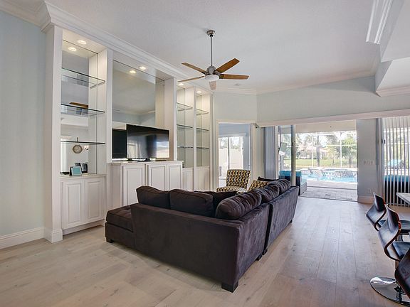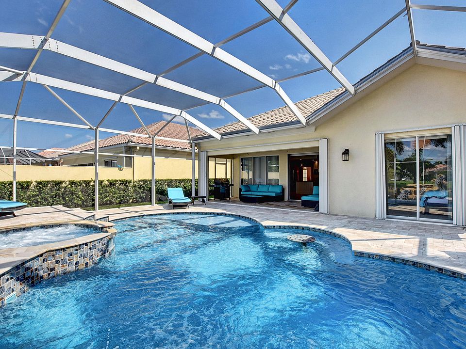 Enjoy Florida living in fabulous pool home in Resort Style Villagewalk of Wellington. Oakmont model 3 bedrooms plus Den with amazing outdoor living. Custom salt water heated pool with Spa, water fall controlled by app on your phone. Relax and watch TV on patio decorated w/Cedar wood panels & Travertine pavers. Many upgrades like high quality engineering wood floors, custom 7'' baseboards & crown moldings, throughout house. Custom lighting. Central vacuum,. Updated kitchen & bathrooms with Quartz River Finish countertops, sinks. Upgraded appliances in the kitchen, front load washer & dryer, Rheem EcoNet Water Heater, security cameras. Accordion shutters around the house & patio. Villagewalk is Resort Style community with restaurant, clubhouse, resort style & lap pool, 24/7 fitness center