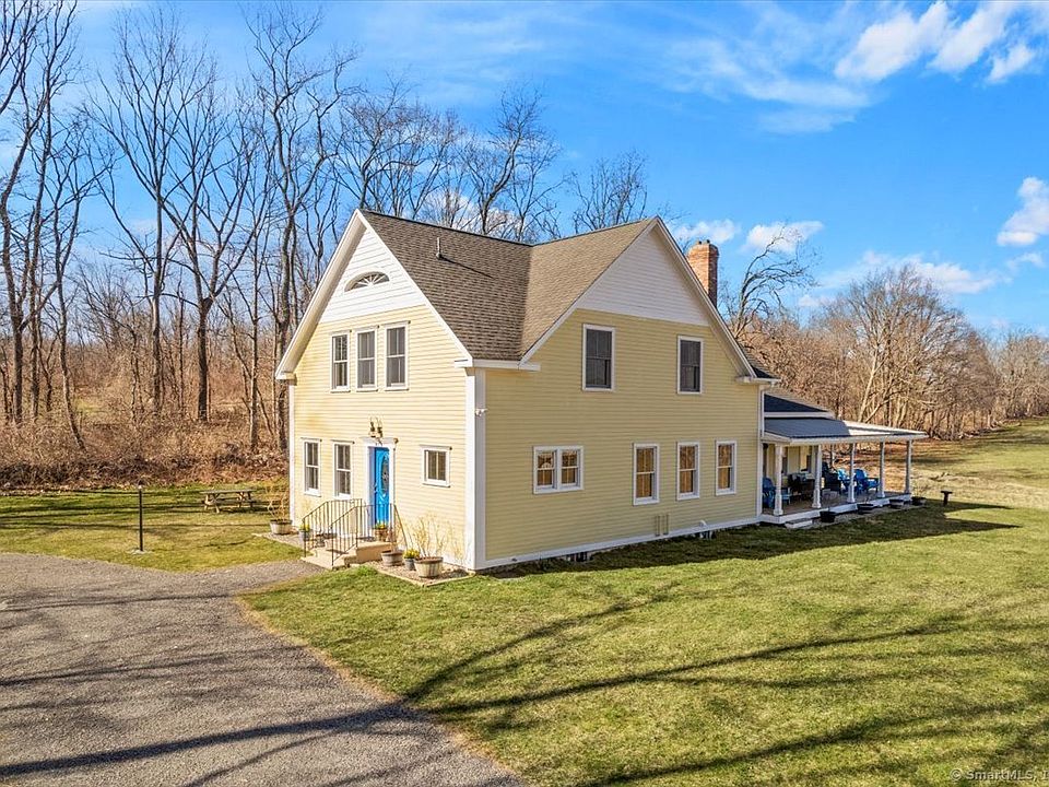 Introducing the serene elegance of 818 Goshen Hill Road, nestled in the historic and pastoral landscape of Lebanon, CT. This exquisite Federal Style Farmhouse is a haven of tranquility, boasting views of lush acres and a neighboring farm teeming with a delightful array of farm animals. The property's two acres are a horticultural dream, featuring an orchard of apple, pear, and peach trees, alongside eight buckets of treasured heirloom blueberries, all meticulously tended. Step inside to discover a harmonious blend of traditional charm and modern amenities. The heart of the home is the open-concept kitchen and living room, where recent renovations shine. The kitchen is a culinary artist's delight, complete with gleaming stainless-steel appliances, a charming farmhouse sink, and expansive quartz countertops. The living room is the epitome of comfort, with a pellet stove that adds a warm ambiance to chilly winter evenings. Adjacent to the living room, the spacious "Viewing Room" is a sanctuary of light, offering panoramic views of the surrounding beauty through its ample windows, and features "The Frame" television for an elevated entertainment experience. The main level also houses a formal dining room and a luxurious primary suite. Ascend to the upper level to find two additional bedrooms, another full bathroom, a versatile bonus room, and a large sitting area, all adorned with rich wood flooring that extends throughout the home. The lower level offers generous space, adding to the home's allure. Located opposite the Bartlett Brook Wildlife Management Area, outdoor enthusiasts will revel in miles of trails perfect for walking, biking, horseback riding, and more. With an easy commute to Hartford, UConn, and the Connecticut and Rhode Island shorelines, this magnificent home is more than just a residence-it's a lifestyle waiting to be embraced.