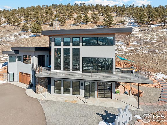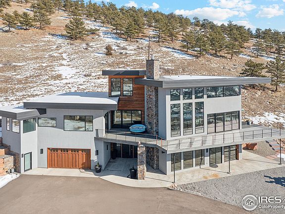 Simply elegant, fabulously functional, and highly efficient- this stunning Kenny Lee-designed custom home on 1.3 acres in Lyons offers an unparalleled living experience. Walls of windows capture breathtaking, million-dollar views of the snow-capped Back Range, Continental Divide, foothills, and star-studded night skies. Enjoy seamless indoor-outdoor living with panoramic vistas of Longs Peak, Mount Meeker, Mt Lady Washington, Boulder County open space and the entire Lyons valley. Unwind in the tranquility of foothills living, surrounded by gorgeous sunsets and remarkable wildlife or take a short cruise into town on your EZGo golf cart to take in all Lyons has to offer. Designed for sophisticated living, this 5,200 SF home boasts superior craftsmanship, energy efficiency, and high-end finishes. Take the floating staircase to the awe-inspiring great room with soaring windows and a sleek and stylish European-style galley kitchen featuring Thermador appliances, an expansive island, spacious living and dining, and a cozy fireplace. The walkout lower level offers a versatile Bonus/Studio/Flex space with heated, polished concrete floors and a 7'x8' glass roll-up door- a perfect space to gather with family and friends, explore your inner artist, or a future ADU. Conveniently located near restaurants, schools, parks, trails, the river, music festivals, and more, with easy access to Boulder, Denver, DIA, and Rocky Mountain National Park. Request our property brochure to explore the full list of remarkable amenities this exceptional home has to offer!