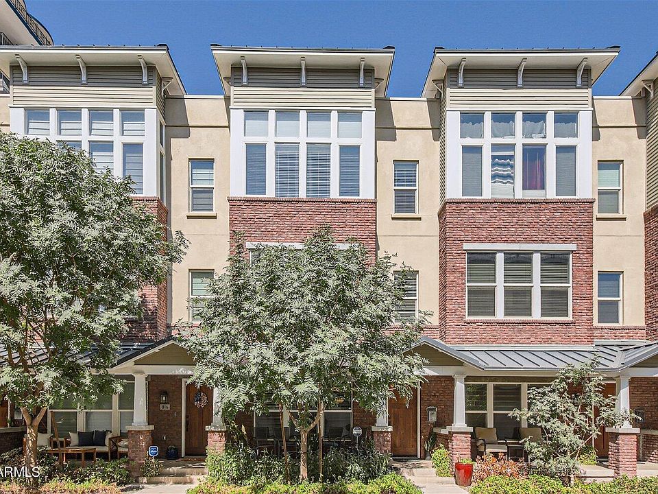Contemporary luxury Townhome in the heart of Roosevelt Row downtown Phoenix. Walking distance to sports arenas, entertainment, dining and much more. The large chefs kitchen offers stainless steel appliances, gas range, pantry, large peninsula breakfast bar with seating for 5. 1st Floor offers a generous Den/Office space, 2 car garage with storage. Main floor offers expansive Living and Dining areas with high ceilings large windows and exposed wood beams, kitchen and half bath. Upstairs offers split bedrooms, primary bedroom offers soaring vaulted ceilings, walk-in closet, large glass shower and double vanity. 2nd bedroom has large wardrobe closet, ensuite bathroom with large glass shower. Upstairs laundry. Highly desirable downtown location.