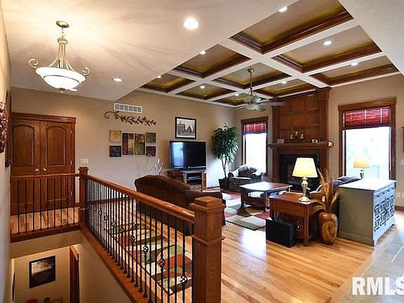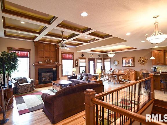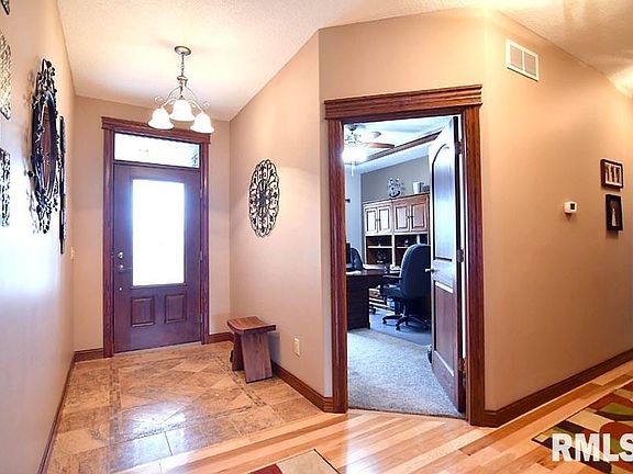 Come look and be amazed at this custom ranch home! As you enter the home you notice the custom woodwork throughout. Great room has coffered ceilings with wood inserts and accent lighting along with Custom fireplace mantel and surround and fireplace with circulating fan. Flooring is 3/4"Hickory.Kitchen/Dining area includes tray ceiling with accent lighting, hickory cabinetry with above and below lighting and other extras, breakfast bar, granite tops, plus walk-in pantry. Laundry/Mud room includes 3/4 bath. Large Master Suite has tiled walk-in Shower and upgraded double vanity and linen closet. Main floor office can be additional bedrm. Walk-out basement is finished with large rec room, 2nd kitchen and bar area, two Bedrms, 3/4 bath and craft room with utility sink. Home has Geo Thermal heating and cooling, zoned temp controls, heated floors in basement and in the garage. Garage has additional workshop area with basement under. Outside has composite deck and poured patio. So much more!
