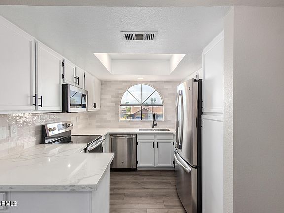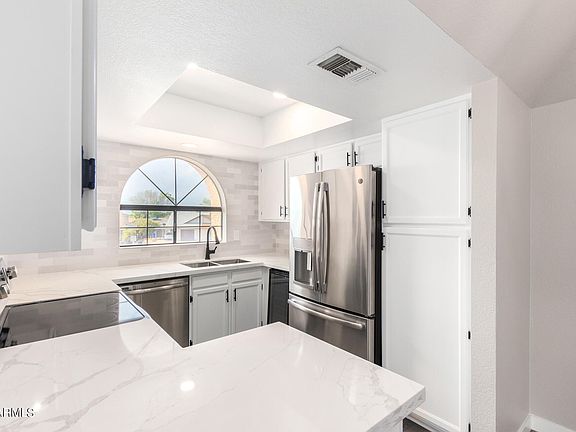 Welcome to Fiesta Park Village, where this BEAUTIFULLY UPDATED unit awaits you! Providing 2 beds & 2 baths, it perfectly blends modern style and comfort. Fabulous interior offers NEWER features that you'll surely love! Natural light filled the spaces, complemented by a fresh neutral palette, new lvp flooring, and new ceiling fans & light fixtures. Discover the large living room that boasts vaulted ceilings w/exposed beam! The spotless eat kitchen has new SS appliances, quartz counters, subway tile backsplash, & white cabinetry. Main bedroom includes an ensuite w/dual quartz sinks & two closets. Laundry room displays shelving. Check out the cozy balcony, an ideal spot for relaxing! The 2 assigned parking spaces is a plus. Enjoy the Community pool just nearby! Make it yours!