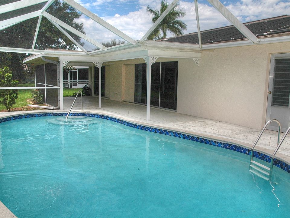 Southern rear exposure pool home in convenient area of South Cape Coral with split bedroom floor plan. Property features high ceilings, large open living space, formal dining room, updated bathrooms, and a large side load garage. The living room and master bedroom both have pocketing sliders out to the pool. The pool area is large and screened with lots of shaded seating and eating space and access to a bathroom. Newer tile and wood-like laminate throughout the living area with carpeting in the bedrooms. Schedule your showing today to see this property before it's gone!