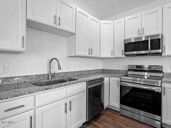 Beautiful new construction home featuring an open layout with 3 bedrooms, 2 full bathrooms and laundry room with access to the backyard. Inside features a vaulted ceiling throughout the great room and kitchen areas. All remaining rooms offer 9' ceilings throughout with recessed can lights, craftsman style trim, 42'' shaker cabinets. Kitchen has stainless steel appliances and plenty of cabinets for added storage plus a bar seating area with granite countertops. This open layout throughout the kitchen, dining & living areas lives and feels open and airy. Laminate flooring in the kitchen, dining area, hallways and laundry room, tile in both bathrooms and carpet in the three bedrooms. All bedrooms are on one level with 2 guest bedrooms split by the shared full bathroom. The Primary Bedroom is located on the back of the home with a walk in closet. The bathroom has tile floors, dual sinks with quartz countertops & a large walk in shower with tile walls all the way to the ceiling! Laundry room with backdoor access to the back yard. This is one of 7 new homes being built side by side. Enjoy all the town amenities of Burgaw and only 30 minutes from Wilmington. Easy to show, contact a realtor today for more information. Seller offering 2,500 use as you choose allowance.