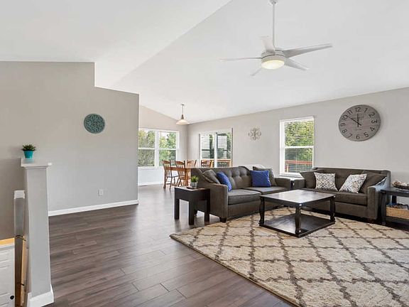 Great room ranch located on cul-de-sac, sitting on premium lot backing to woods/common ground. As you enter you are greeted by new grey luxury vinyl flooring throughout the vaulted great room, breakfast room and kitchen. All bedrooms have new carpet (2018). Main living space has been freshly painted neutral. Kitchen has breakfast bar area great for a few bar stools, stainless appliances. Kitchen and breakfast room are vaulted. Door from breakfast room to the large deck is great space for morning coffee or those evening BBQs. Enjoy the nature sitting on the deck overlooking the wooded view. Master bedroom has vaulted ceiling with large plant shelf and walk in closet. Master bath suite featuring sep soaking tub & shower, single sink with vanity area. Convenient main floor laundry next to the bedrooms. Ceiling fans throughout. The lower level has 9 foot pour, some of the framing has been started and waiting your finishing touches. The lower level is a walk out and has a rough in bath.