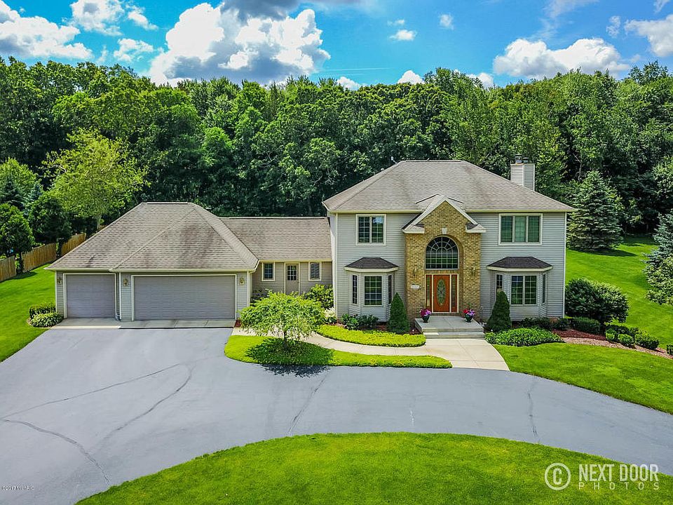 This custom built one owner property situated on nearly 1.5 acres in Caledonia schools is waiting for new owners who will appreciate it as much as the current ones do! With a welcoming grand entry, formal dining room, office, half bath and living room w/ fireplace all on the main floor; there is plenty of living space. The kitchen is open and inviting with a large snack bar/island and eating area. A spacious year-round sunroom connects to the deck outside with a pathway leading to the fenced inprivate + large in-ground pool. A full laundry room and mudroom area complete the main floor. Upstairs provides the master suite with walk-in closet and spacious private bathroom, two additional bedrooms and full bathroom. The lower level offers family room with fireplace, exercise room, storage room and another bedroomwith full bathroom. Extra features include home speaker system, 3 stall garage Thermador appliances, newer flooring, wooded lot, wrap around driveway, Corazzo floor coating in
