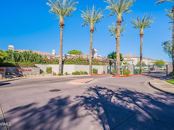 PRICE CUT - End-unit townhome in IDEAL LOCATION! Welcome to Vintage - an intimate gated enclave just minutes from all that Scottsdale has to offer. You'll be met with cascading sunlight in the open concept living space featuring vaulted ceilings, a gas fireplace and wood floors that carry into both bedrooms. Challenge your culinary skills in the kitchen offering white cabinets, granite counters, stainless steel appliances and a breakfast bar. The double door entry to the spacious primary bedroom will welcome you to your serene sanctuary. The ensuite offers recent on trend updates and a generous walk-in closet. The second bedroom makes an optimal office or provides plenty of space for visiting family and friends. It is complimented with a full bathroom. Enjoy the cool Arizona evenings on your balcony or venture to the pool/spa to gather with neighbors or fire up the grill. Interior stairs will lead you from your extended one car garage up to your GORGEOUS one level living townhome. Just minutes from shopping, dining, arts, culture and 101 for easy access to sporting events or the airport.
