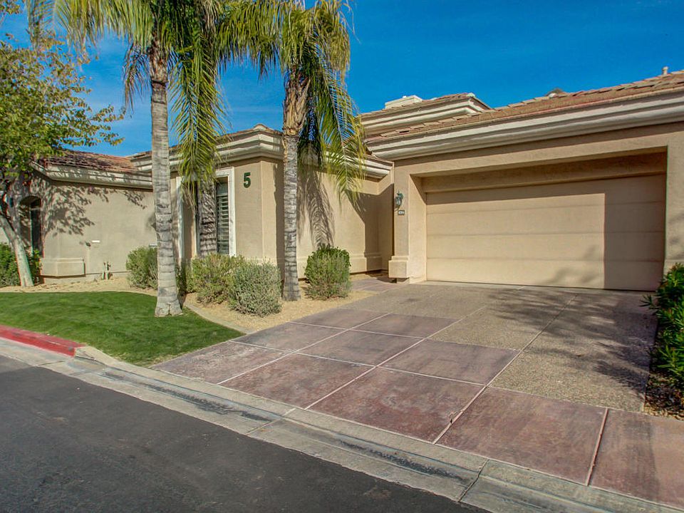 Great Scottsdale Location! Hard to find, model perfect, single level Patio Home. Gated Community. NEW ROOF 2016! Upscale 2 bedroom, 2.5 bathrooms, with office/den &tile floors, upgraded carpeting. Kitchen with gas range, microwave, center island, eat in kitchen and a sliding door to back yard with covered patio. Split floor plan, two tone paint, ceiling fans throughout, wood shutters, gas fireplace and upscale lighting. Back yard has grass area with view fencing to wash. Epoxy garage floors and storage cabinets with 2 car garage. Community heated pool and spa. Front yard maintenance taken care of. First class place to live.