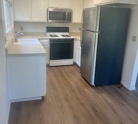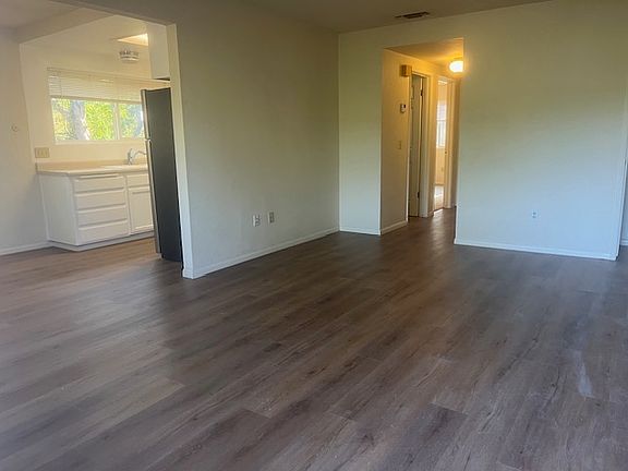 Upstairs, 2 bedroom with new laminate flooring, air conditioning and coin laundry. Lots of storage, 1 bathroom, 2 parking spaces. Lush yard, Clean and available now. Bedrooms have carpet. Kitchen appliances include stove, microwave, refrigerator. Water and trash is paid, tenants pay gas and electric. No smoking, cat okay. One year lease. Deposit due upon signing, rent due on move in day.