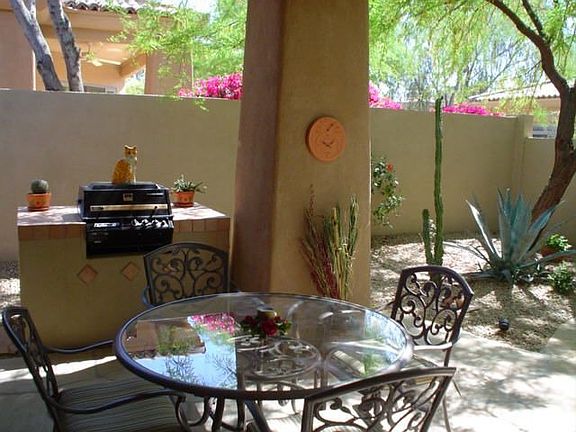 Immaculate home in the exclusive guard gated golf community of Grayhawk. 3 bed, 2 baths make this a wonderful place to call home. The recently renovated home boasts brand new paint,high ceilings, neutral colors, ceiling fans, tile & carpet throughout. The kitchen includes double ovens, newer granite countertops & spacious island. The wonderful backyard is like a private retreat w/ a cozy gas fireplace, 2 covered patios, lush landscape, a built-in BBQ & gas firepit. Solar & a new highly energy efficient A/C reduces the electric bill considerably. You can't beat the location, w/ fabulous shopping, dining & easy access to the 101 freeway!